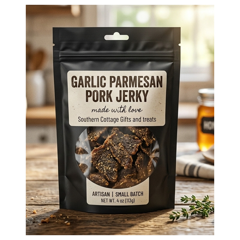 Garlic Parmesan Pork Jerky delivers a savory, robust flavor with roasted garlic and aged parmesan notes that create a rich, slightly salty finish.